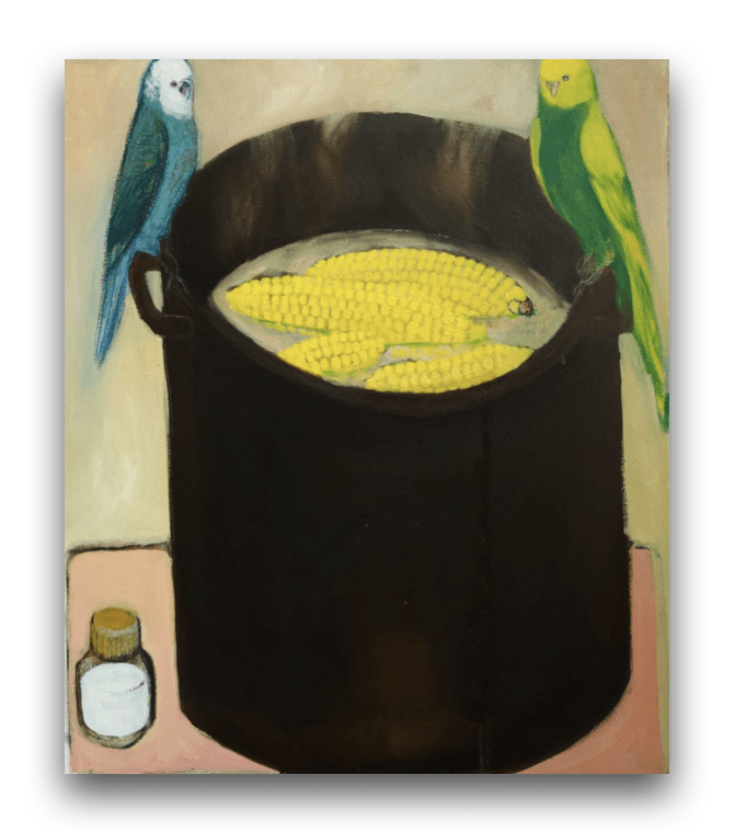 SOLD Jarmila Sabová Džuppová – Hrniec s kukuricou a andulkami, 50 x 60 cm